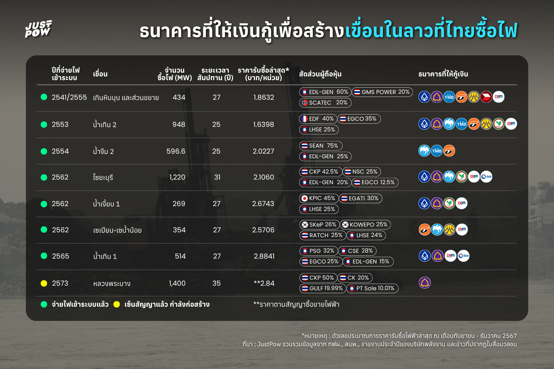 ไม่เพียงแค่บริษัทในประเทศไทยเท่านั้นที่ไปลงทุนในการสร้างเขื่อนลาวแล้วขายไฟให้ไทย แต่โครงการสร้างเขื่อนในลาวยังได้รับเงินกู้จากธนาคารในประเทศไทยอีกด้วย โดยพบว่า