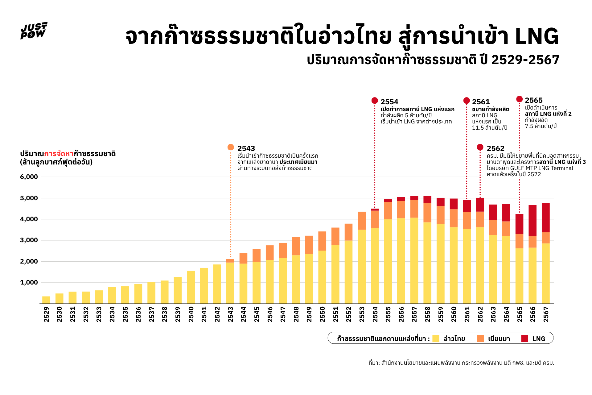 ในช่วงหลายทศวรรษที่ผ่านมา ประเทศไทยเปลี่ยนผ่านจากการใช้ถ่านหินและน้ำมันผลิตไฟฟ้า ไปสู่ยุค ‘โชติช่วงชัชวาล’ จากการค้นพบและใช้ประโยชน์จากก๊าซธรรมชาติในอ่าวไทย แต่เนื่องจากก๊าซในอ่าวไทยส่วนหนึ่งถูกนำไปใช้สร้างมูลค่าในอุตสาหกรรมปิโตรเคมี ทำให้การจัดหาก๊าซเพื่อผลิตไฟฟ้าไม่เพียงพอต่อความต้องการที่เพิ่มขึ้น ไทยจึงจำเป็นต้องจัดหาก๊าซเพิ่มเติมจากแหล่งภายนอก ทั้งจากเมียนมา และการนำเข้าก๊าซธรรมชาติเหลว (LNG) จากต่างประเทศ ความจำเป็นนี้นำไปสู่การลงทุนมหาศาลในโครงสร้างพื้นฐานเพื่อรองรับการนำเข้าก๊าซ