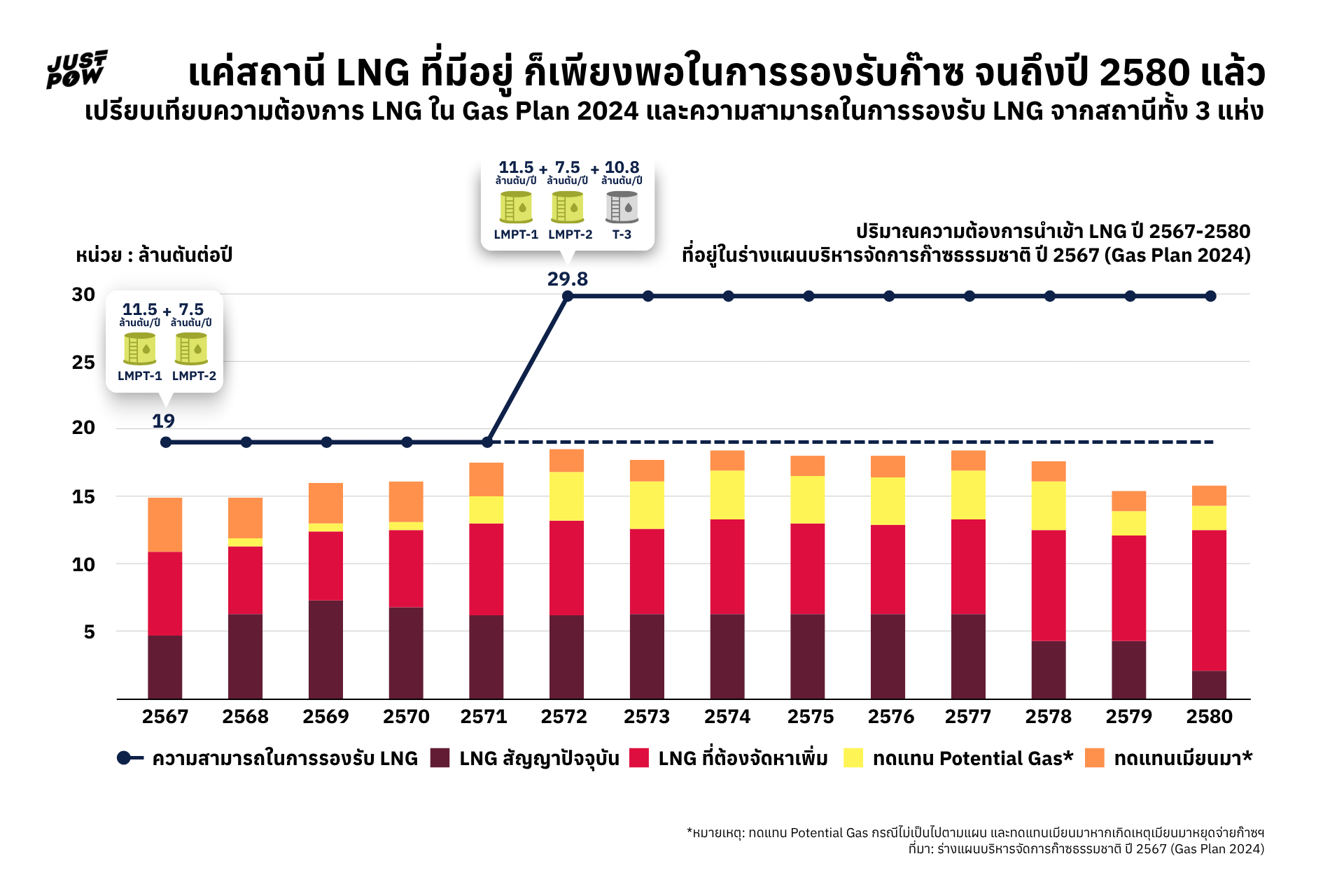 นอกจากนี้ เมื่อนำตัวเลขแผนการนำเข้า LNG ในร่าง Gas Plan 2024 มาเปรียบเทียบกับขีดความสามารถในการรองรับ LNG จากสถานี LNG ทั้ง 3 แห่ง พบว่า ปริมาณการจัดหา LNG ทั้งจากสัญญาปัจจุบันและที่ต้องจัดหาเพิ่มระหว่างปี 2567-2580 มีค่าเฉลี่ยอยู่ที่ไม่เกิน 15 ล้านตันต่อปี แม้ในกรณีเลวร้ายที่สุด คือแหล่ง Potential Gas ไม่เป็นไปตามแผน หรือไม่สามารถนำเข้าก๊าซจากเมียนมาได้ ปริมาณการจัดหา LNG ก็ยังคงเฉลี่ยไม่เกิน 20 ล้านตันต่อปี จึงอาจกล่าวได้ว่า ความสามารถในการรองรับ LNG จากสถานี LNG เพียง 2 แห่งแรก (รวม 19 ล้านตันต่อปี) ก็เพียงพอต่อความต้องการก๊าซธรรมชาติของประเทศตลอดระยะเวลาของแผน Gas Plan และแม้ว่าสถานีแห่งที่ 3 อาจถูกนำมาใช้เสริมการทำงานในบางช่วงเวลาของปี เช่น ช่วงที่ความต้องการใช้ไฟฟ้าสูงสุด (Peak Demand) หรือในสถานการณ์ฉุกเฉิน ทว่าการใช้งานดังกล่าวก็จะไม่เป็นการใช้ประโยชน์จากศักยภาพสูงสุดของสถานี