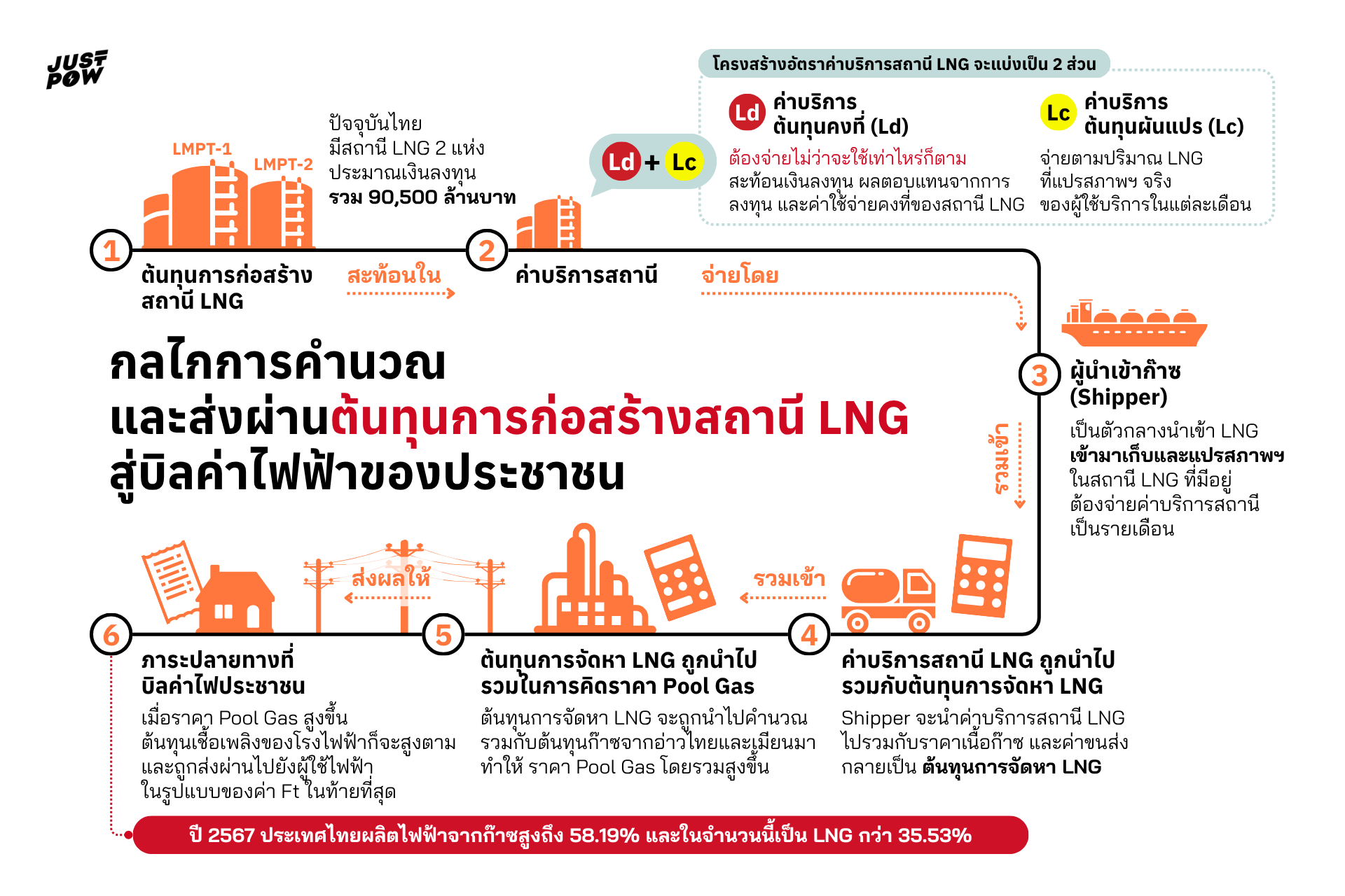 จะเห็นว่า ค่าบริการส่วนสำคัญที่สะท้อนต้นทุนการลงทุนก่อสร้างสถานี LNG คือ ค่า Ld (Demand Charge) ซึ่งเป็นต้นทุนคงที่ที่ไม่ใช้ก็ต้องจ่าย แม้ว่าผู้ที่รับผิดชอบชำระค่าบริการให้กับสถานี LNG โดยตรงคือ ผู้รับใบอนุญาตจัดหาและค้าส่งก๊าซธรรมชาติ (Shipper) ซึ่งทำหน้าที่เป็น ‘ตัวกลาง’ ในการนำเข้าก๊าซ จากต่างประเทศ แต่ประชาชนผู้ใช้ไฟฟ้าก็ได้รับผลกระทบทางอ้อมอย่างหลีกเลี่ยงไม่ได้ เนื่องจากประเทศไทยได้มีการกำหนดราคาจำหน่ายก๊าซธรรมชาติในรูปแบบของ ราคา Pool Gas ซึ่งเป็นราคาเฉลี่ยของก๊าซธรรมชาติที่จัดหามาได้ทุกแหล่ง ได้แก่ ก๊าซจากแหล่งในประเทศ (รวมอัตราค่าผ่านท่อก๊าซในทะเล) ก๊าซธรรมชาตินำเข้าจากประเทศเมียนมา (รวมอัตราค่าผ่านท่อก๊าซเพื่อส่งมาประเทศไทย) และก๊าซธรรมชาติเหลว (LNG) นำเข้าจากต่างประเทศ (รวมค่าใช้จ่ายนำเข้าและค่าบริการสถานี LNG) ดังนั้น หากค่าบริการสถานี LNG สูงขึ้น จะส่งผลให้ต้นทุนการจัดหา LNG ของ Shipper เพิ่มสูงขึ้น และเมื่อต้นทุนดังกล่าวถูกนำไปคำนวณรวมในราคา Pool gas ก็จะทำให้ต้นทุนเชื้อเพลิงโดยรวมสูงขึ้นตามไปด้วย ซึ่งท้ายที่สุดจะส่งผลต่อการคำนวณค่าไฟฟ้าผันแปร (ค่า Ft) และสะท้อนไปยังบิลค่าไฟฟ้าที่ประชาชนต้องจ่ายในที่สุด
