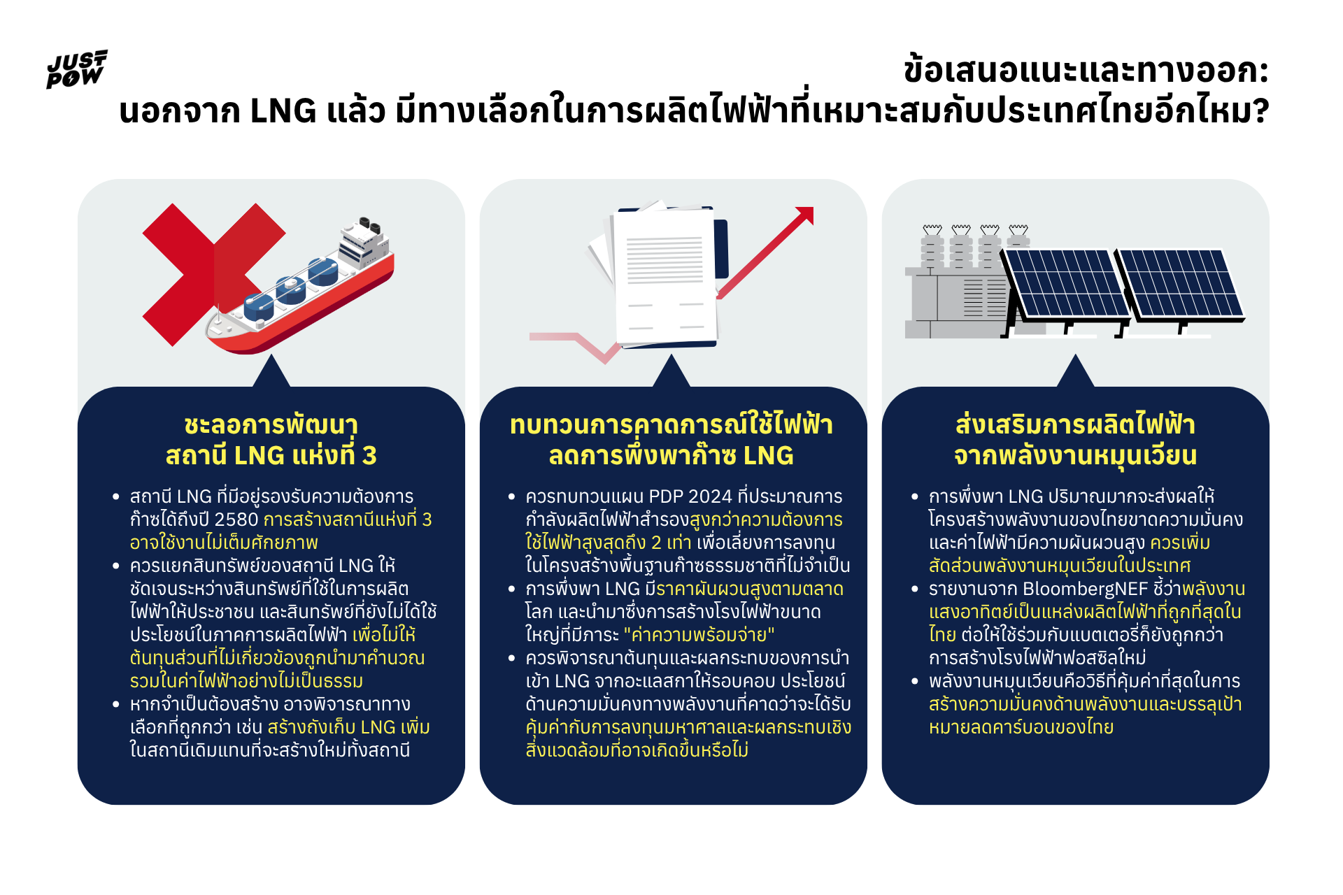 1. ทบทวนการคาดการณ์ใช้ไฟฟ้าที่สูงเกินจริงในร่างแผน PDP 2024 และหยุดสร้างโรงไฟฟ้าก๊าซเพิ่ม เพื่อลดการพึ่งพาก๊าซธรรมชาติและการนำเข้า LNG