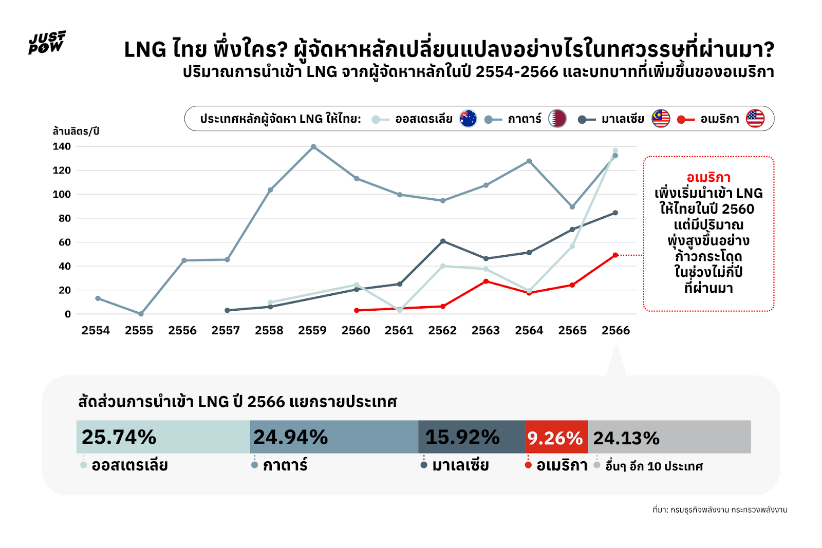 แม้ตลอดทั้งปี 2566 ออสเตรเลียและกาตาร์จะเป็นสองประเทศหลักที่ไทยเลือกพึ่งพาในการนำเข้า LNG โดยมีสัดส่วนรวมกันกว่าร้อยละ 50.68 หรือมากกว่าครึ่งหนึ่งของปริมาณนำเข้าทั้งหมด ทว่า สหรัฐอเมริกา ที่มีปริมาณการนำเข้ารวม 49.19 ล้านลิตร อาจดูเป็นสัดส่วนที่น้อย แต่เมื่อเทียบกับปีก่อนหน้าที่เคยนำเข้า อยู่ที่ 24.18 ล้านลิตร จึงนับเป็นการนำเข้าที่เพิ่มขึ้นอย่างก้าวกระโดดกว่า 103.43%